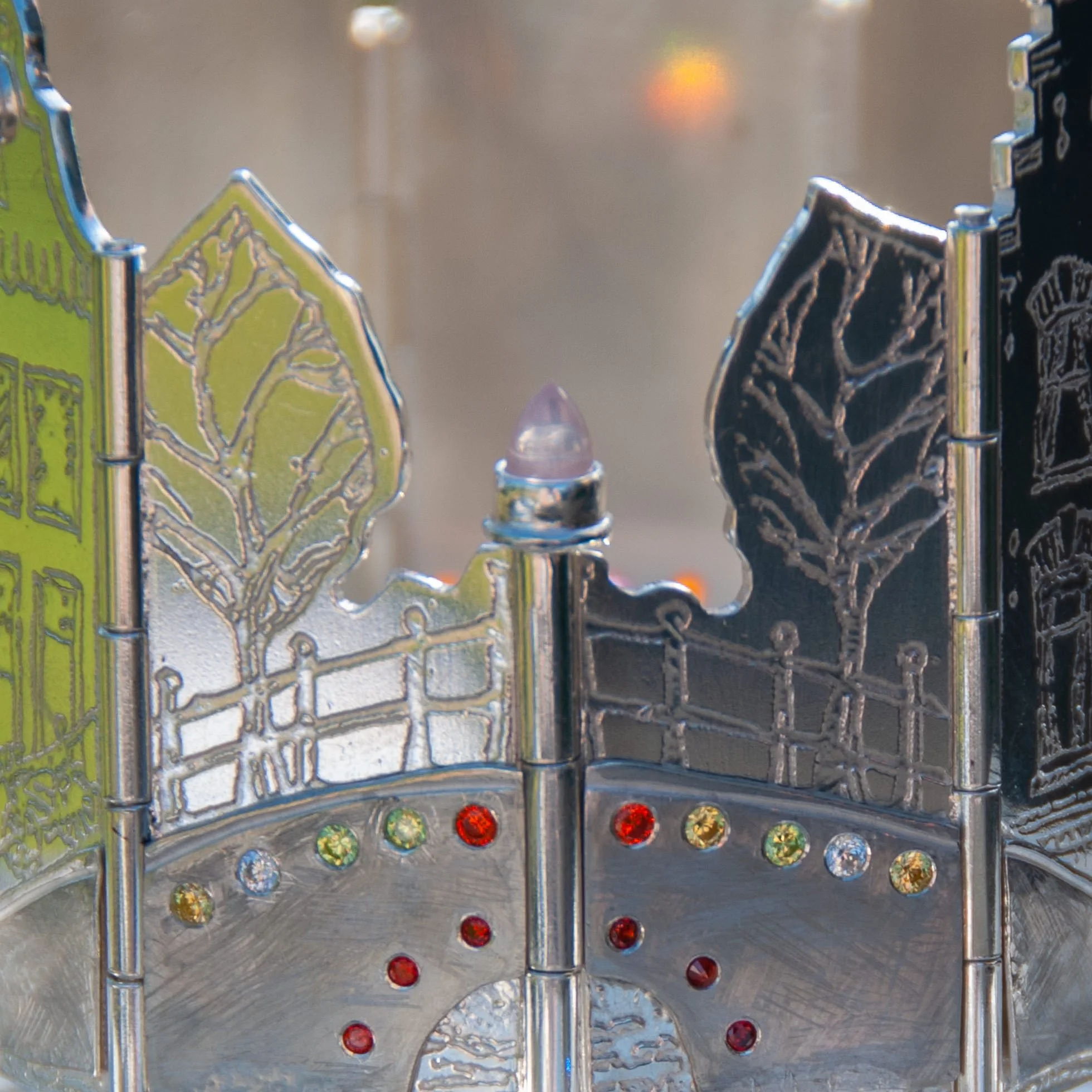 The stones: a Pink Tourmaline marks the 'red light' basement window, a Green Tourmaline balloon, Pink Tourmaline and Pale Citrine light up the attic windows. The party boat and bridge are lit with a mixture of coloured stones.